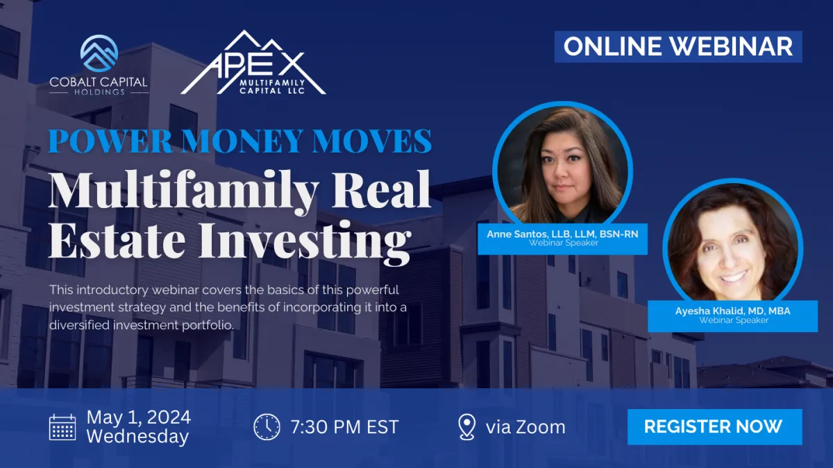 With a background in corporate law and healthcare, Anne Santos serves as Managing Partner at Cobalt Capital Holdings LLC. She has navigated the real estate investment landscape since 2001, operating single-family and vacation rental properties both domestically and internationally. Anne is a General Partner in 334 units with $32 million in assets under management and is a Limited Partner in over 2000 multifamily doors. With a focus on commercial multifamily investments in Texas, Georgia, Arkansas, Florida and the Carolinas, Anne is dedicated to delivering well-curated top-tier opportunities to investors.